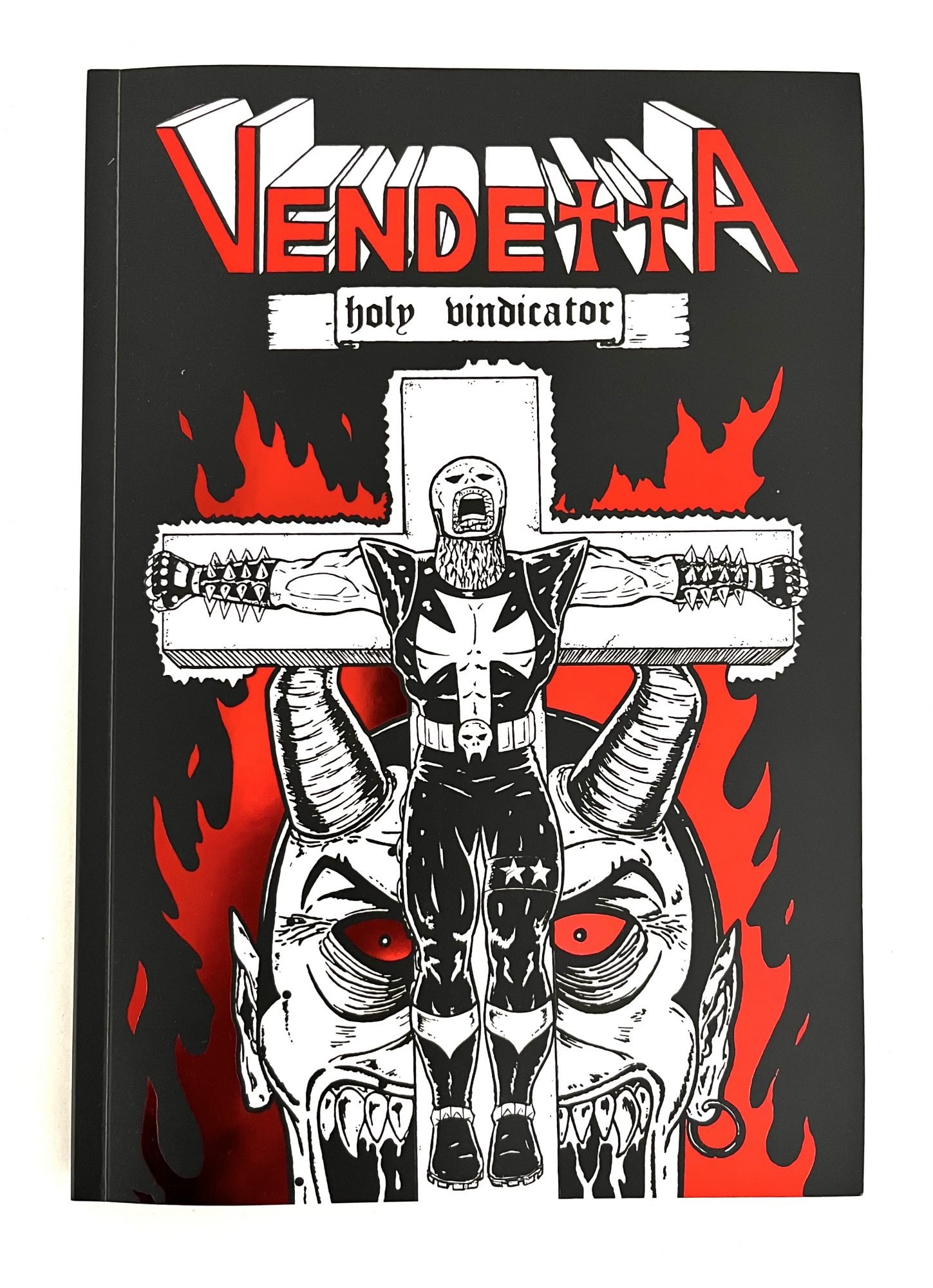Just when we thought we’d seen every supreme extreme in the superhero megaverse… we unearthed the decades-old, skin-flayingly singular work of Steve McArdle and his Red Bullet Comics imprint. From the start, McArdle was a maestro of blood and mayhem, an overlooked ’90s creative genius wrapped in black leather and raw ambition. In his undisputed masterpiece Vendetta: Holy Vindicator, skulls, spikes, motorbikes, chains, more chains, and Satan collide at thrash-metal speed in what may be the most intensely confident entry to the self-published comics canon… ever.